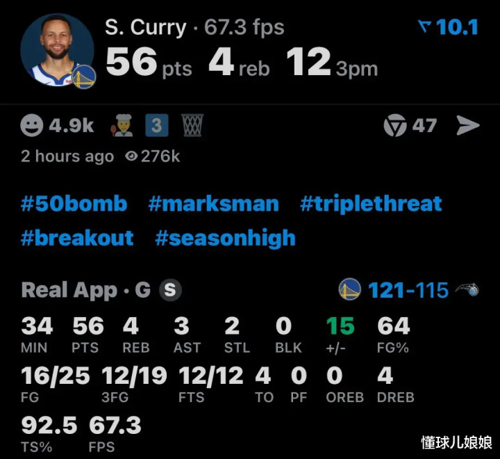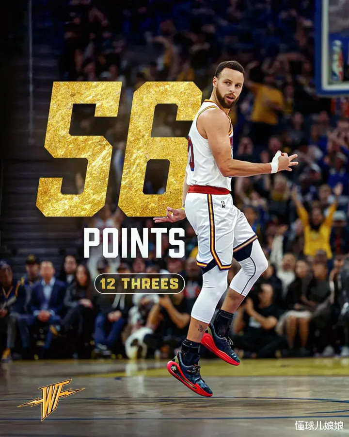 全场库里25投16中,3分球19投12中,罚球12中12,拿到了56分4板3助2断。